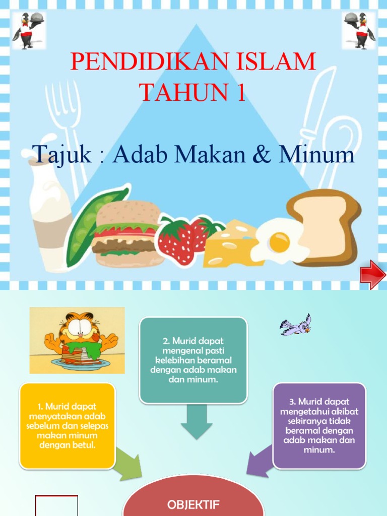Rancangan Pengajaran Harian Adab Makan dan Minum Adab Minum dan Makanan Halal RANCANGAN PENGAJARAN HARIAN. ADAB MAKAN DAN MINUM MENURUT ISLAM. Lauk kita geserserahkan kepada orang lain dan nasi dari orang lain kita ambildekatkan kepada kita.